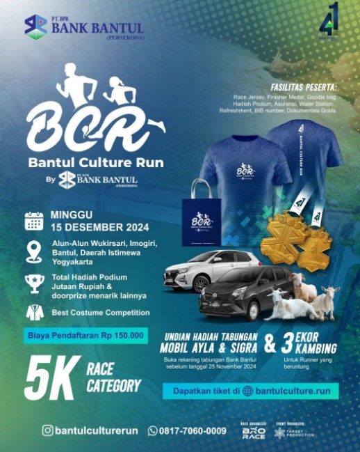 Sobat Jogjaasik, Bantul Culture Run hadir bukan hanya untuk ajang olahraga, Bantul Culture Run diselenggarakan sebagai upaya untuk mempromosikan potensi wisata budaya di Kabupaten Bantul dan dalam rangka HUT Bank Bantul ke 41 Tahun.