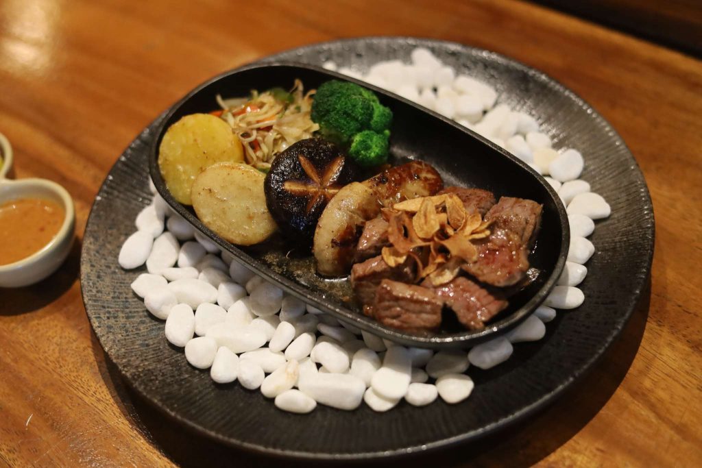Satu per satu hidangan terus disajikan. Main course yang dipilih adalah Japanese steak wagyu. Ada tiga iris daging sapi tebal yang empuk dan disajikan dengan hibachi untuk mempertahankan kehangatan serta memberikan crust dan char grill yang sempurna. Daging ini disajikan dengan tiga macam saus, yaitu saus jepang, plun, dan sambal ala Indonesia. Kata Tanaka, sambal ini memang sengaja disajikan untuk memberikan rasa familiar kepada pelanggannya di Indonesia. Akan tetapi, saus plum yang manis, rasanya jadi saus paling tepat untuk steak ini.