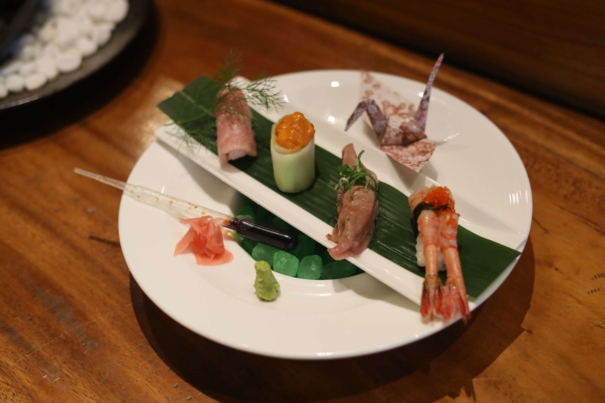 Kini saatnya masuk ke hidangan seafood premium. Dengan cekatan, chef asal Jepang ini mengambil pisau tajamnya dan membersihkan sebelum mengiris ikan segar menjadi irisan tebal sashimi seperti otoro, Hamachi, dan juga uni (bulu babi). Menariknya, untuk mengurangi food waste dan juga penambahan soy sauce yang berlebihan sehingga ‘merusak’ rasa asli ikan, Tanaka memberikan soy saucenya dalam pipet tetes.
