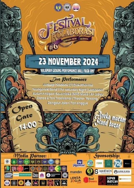Salam Budaya sobat Jogjaasik! Momen yang ditunggu-tunggu akhirnya tiba—Festival Kolaborasi Bahasa, Seni, dan Budaya #6 akan hadir pada Sabtu, 23 November 2024 di Halaman Gedung Perfomance Hall FBSB UNY!