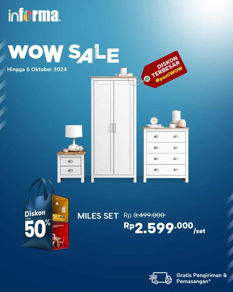 Yang kedua ada satu set perlengkapan kamar termasuk almari pakaian. “Miles Set ini menjawab semua kebutuhan untuk kamar tidurmu. Terdiri dari lemari pakaian, nakas, dan laci; ada cukup ruang untuk penyimpanan pakaian hingga aneka aksesoris. Hadir dengan balutan warna putih serta desain yang serasi, set ini meningkatkan estetika kamar tidur sekaligus menjaga kerapian dan keteraturan,” ujarnya. Satu set perlengkapan kamar tidur ini dilabeli harga Rp 2.599.000 dari sebelumnya Rp 3.499.000.