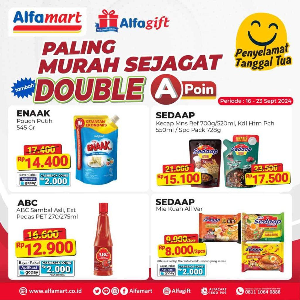 Dikutip dari instagram Alfamart pada Selasa (17/9/2024), ada beberapa penawaran promo Alfamart di Jogja. “Double A-Poin + Cashback Sampai 25%,” ujarnya. Disbeutkan jika belanja makin hemat maksimal di Alfamart dengan promo spesial!. Selain harganya paling murah sejagat, kalian juga bisa dapetin DOUBLE A-Poin untuk setiap pembelian!. “Selain itu, spesial buat kamu yang mau lebih hemat lagi, gunakan voucher cashback dan nikmati cashback sampai 25%. Bayar pakai GoPay ada tambahan Cashback Rp 2.000. Pokoknya super untung banget belanja di Alfamart!,” jelasnya. Dikatakan jika Periode promo adalah 16 – 23 September 2024.