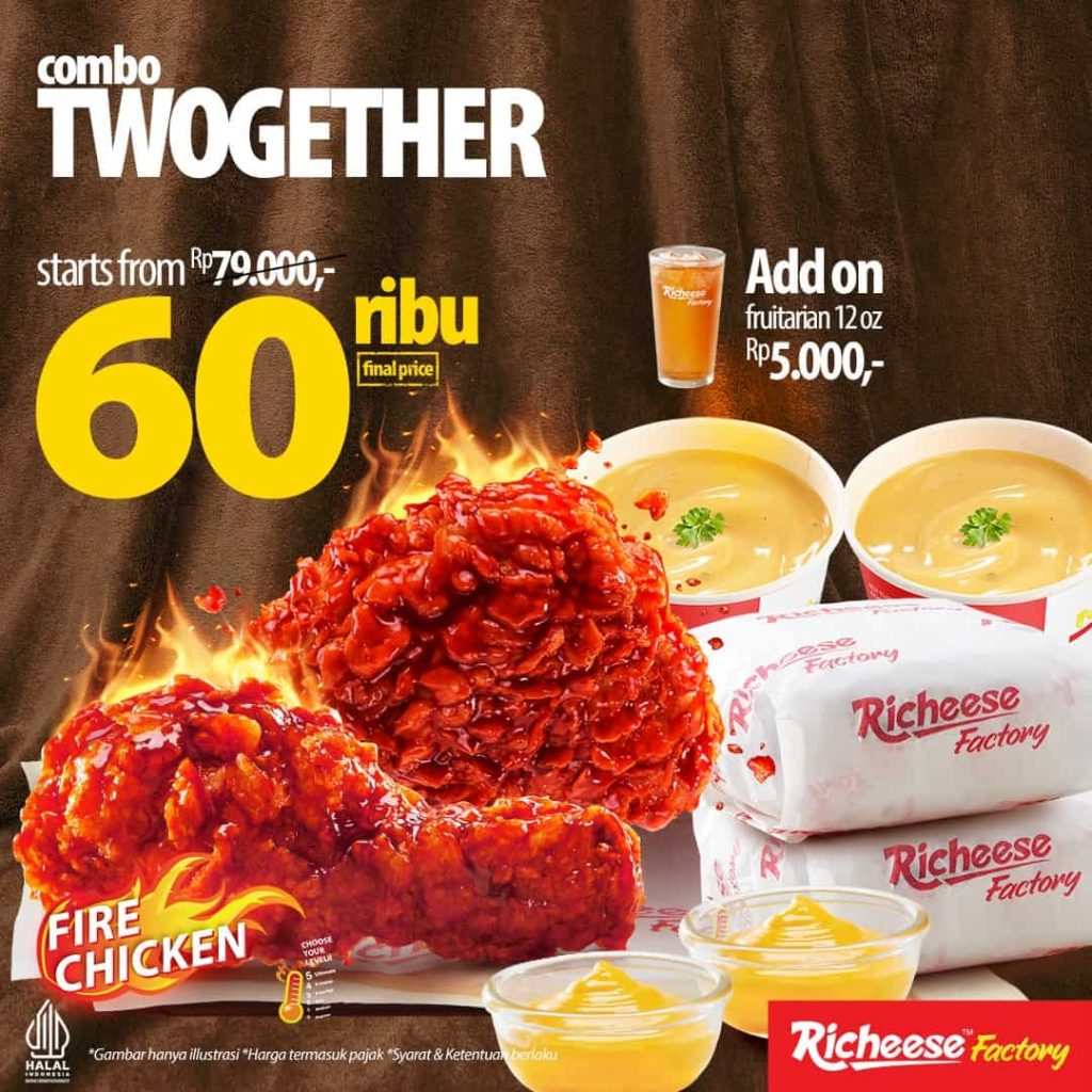 Disebutkan jika dalam promo ini, kalian bisa nikmati COMBO TWOGETHER dari harga Rp 79.000, jadi hanya Rp 60.000 aja. “Kamu bisa nikmati COMBO TWOGETHER dan mendapatkan 2 Fire Chicken, 2 Nasi, dan 2 Cheesy Cream Soup, Dapatkan juga minumannya dengan Add on Drink seharga Rp 5.000, maksimal 2 minuman setiap pembelian 1 pax Combo Twogether,” jelasnya.