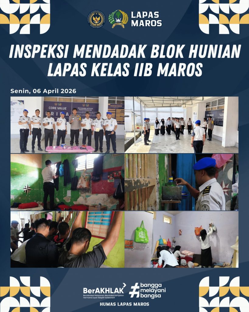 Maros – Dalam rangka memperingati Hari Bakti Pemasyarakatan ke-62, Lembaga Pemasyarakatan (Lapas) Kelas IIB Maros melaksanakan inspeksi mendadak (sidak) gabungan bersama aparat penegak hukum (APH), sebagai upaya memperkuat keamanan dan ketertiban di lingkungan Lapas Maros, Senin (06/04).