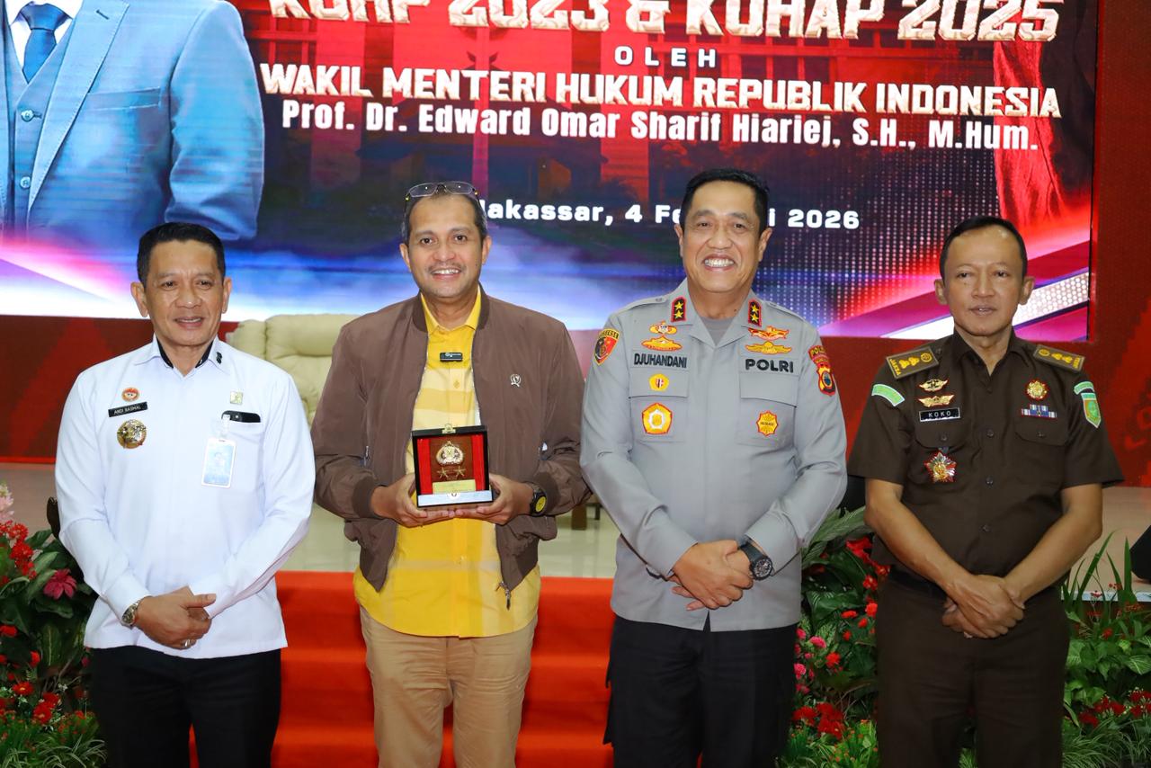 Makassar – Polda Sulawesi Selatan menggelar kegiatan sosialisasi Undang-Undang Nomor 1 Tahun 2023 tentang Kitab Undang-Undang Hukum Pidana (KUHP) dan Undang-Undang Nomor 20 Tahun 2025 tentang Kitab Undang-Undang Hukum Acara Pidana (KUHAP), bertempat di Aula Mappaoddang Mapolda Sulsel, Rabu (04/02/2026).